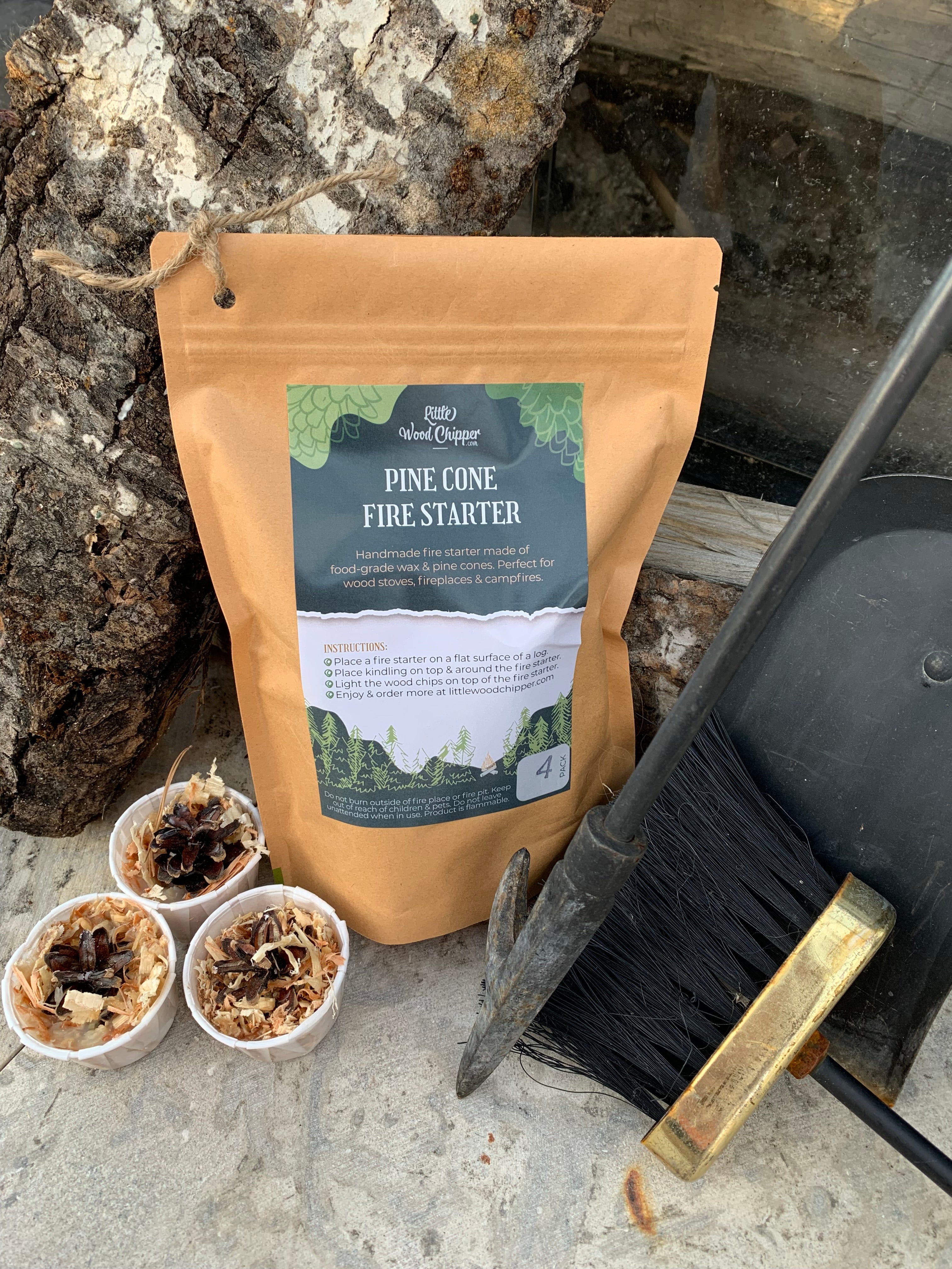 Little Wood Chipper Pinecone Firestarters, eliminate the need for paper, kindling or fuel, to start your fires! Just lay the firestarter on your log, stack some wood pieces around it, light it and your fire is fully established in no time as these burn for approximately 20 mins.